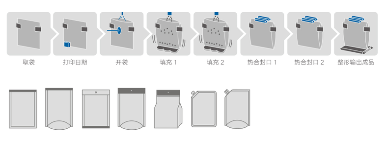 1.上袋系統(tǒng) 2.開拉鏈系統(tǒng) 3.開袋裝置 4.下料系統(tǒng) 5.清理系統(tǒng) 6.熱封系統(tǒng) 7. PLC控制系統(tǒng) 8.輸出系統(tǒng)