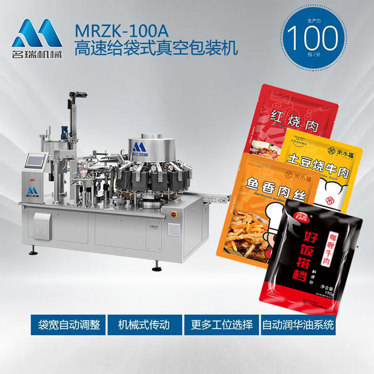 名瑞機(jī)械給袋式真空包裝機(jī),MRZK-100A型號(hào)包裝機(jī)是一款全自動(dòng)食品包裝機(jī)器設(shè)備,針對(duì)預(yù)制菜,料理包,生鮮食品,鹵制品,肉制品,雞爪,鴨脖,鴨舌等食品進(jìn)行真空包裝。搭配上料設(shè)備,下料設(shè)備,密封設(shè)備,打碼設(shè)備等不同配置,可以實(shí)現(xiàn)不同產(chǎn)品一臺(tái)機(jī)器都能完美包裝。